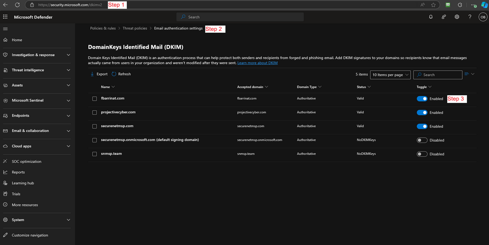 This is a must for most organizations that are worried about email delivery. By default DKIM is off, and it needs to be turned on after DNS records are created, and the option is enabled in the Microsoft 365 Admin portal.